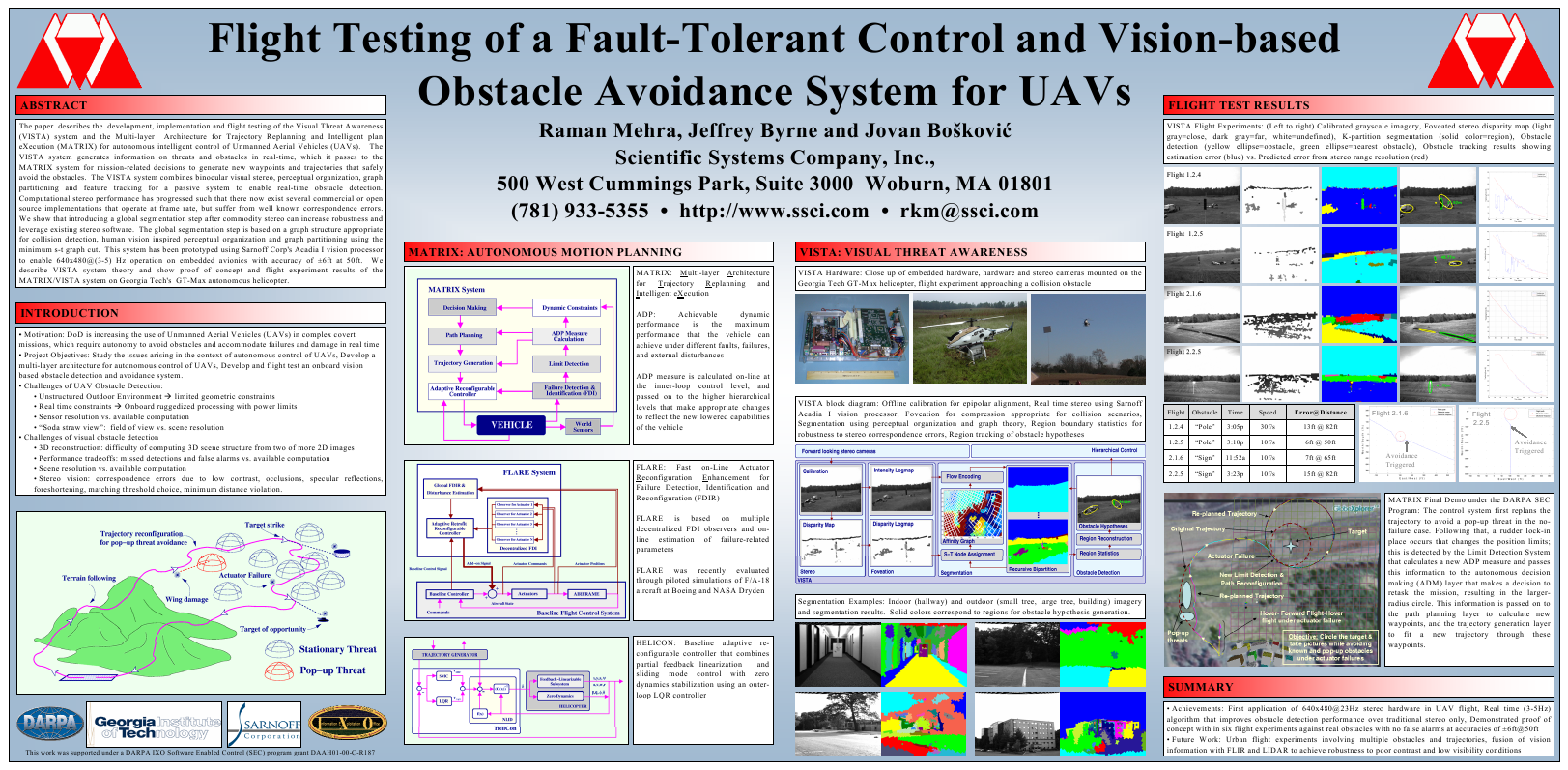 - R. Mehra, J. Byrne, J. Boskovic, "Flight Testing of a Fault-Tolerant Control and Vision Based Obstacle Avoidance System for UAVs", Proceedings of the 2005 Association for Unmanned Vehicle Systems International (AUVSI) Conference, North America, 2005; [pdf][poster]